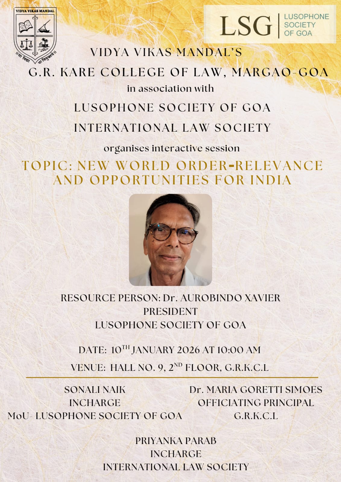 An interactive session with the topic “New World Order – Relevance and Opportunities for India” was held on 10th January 2026, at Kare College of Law, Margao, Goa, organized by Kare College of Law together with LSG – Lusophone Society of Goa, the International Law Society and with support from IGSG Indo German Friendship Society Goa. The resource person was Dr. Aurobindo Xavier, President of Lusophone Society of Goa. Continue reading